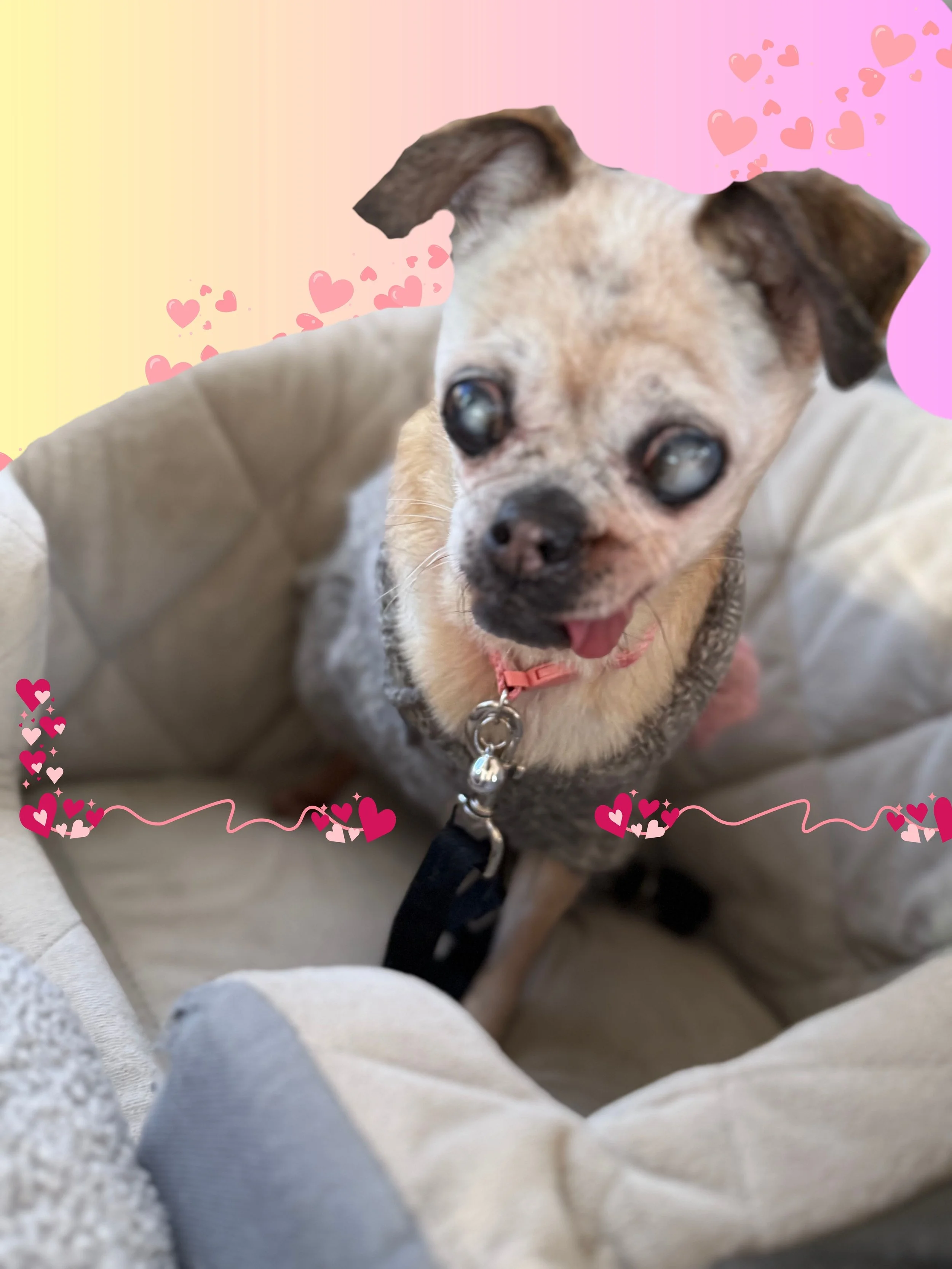 Button is a 10-year-old shelter girl with a heart of gold. This precious Chug (Chihuahua/Pug) has just found her forever home and mama who will shower her with the love and attention she deserves❤️.
